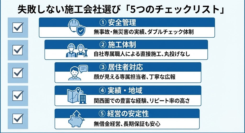 では、数ある施工会社の中から、何を基準に選べばよいのでしょうか? ホームページの雰囲気や、見積もりの安さだけで決めてしまうのは危険です。以下の5つのポイントを必ずチェックしてください。